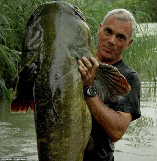 六须巨鲇多生活在欧洲,重150公斤。图中的这条巨鲇是“河怪猎人”杰里米 韦德在西班牙捕捉到的。