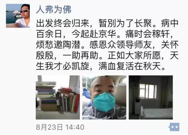 2015年8月23日,陈君在其朋友圈写道:“出发终会归来,暂别为了长聚。病中百余日,今起赴京华。痛时会稼轩,烦愁邀陶潜。感恩众领导师友,关怀殷殷,一助再助。正如大家所愿,天生我才必凯旋,满血复活在秋天。”