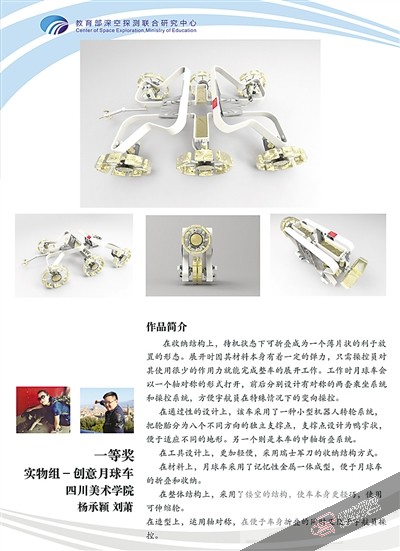 其中来自四川美术学院的杨承颖、刘萧设计的《创意月球车》获得了实物组一等奖,来自重庆大学的陶玮康、宋家来设计的《智能模块化探测月球》和北京邮电大学刘康轩、侯志晗等设计的《“球知号”球形月球探测车》获得创意组一等奖。![]()
