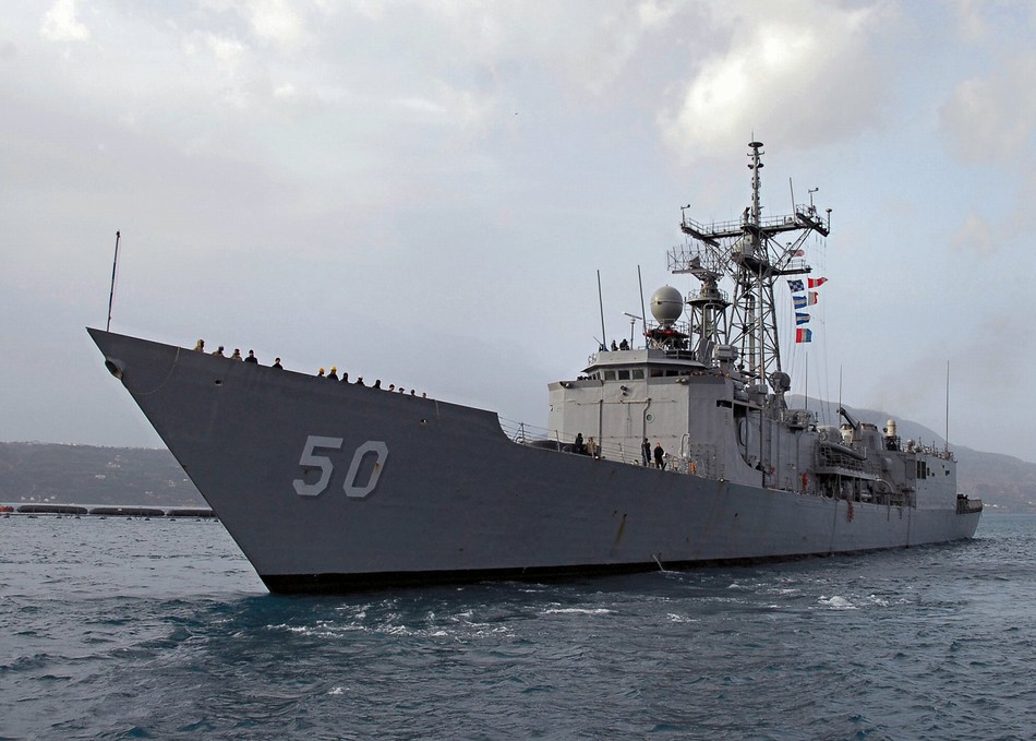 据台湾“中央社”报道,美国总统奥巴马当地时间18日签署1683号“军舰移转法案”,正式同意对台湾地区移转出售4艘佩里级护卫舰。图为泰勒号(USS Taylor)护卫舰。(资料图)