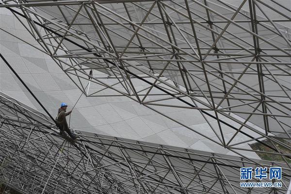 正在贵州省平塘县建设的世界最大单口径射电望远镜——500米口径球面射电望远镜(FAST)目前正在进行反射面面板安装,边长约11米的三角形面板安装已经完成2059块,完成比例达46%。FAST的反射面总面积约25万平方米,用于反射无线电波、供馈源接收机接收,是FAST工程的主线,预计将于2016年4月安装完毕。新华社记者 欧东衢 摄