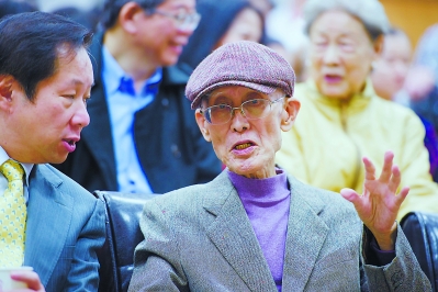 15日,著名文学家、诗人、散文家余光中在台北举行《太阳点名》与《粉丝与知音》两本新书的签书会。图为余光中在新书签书会上与来宾交流。 新华社