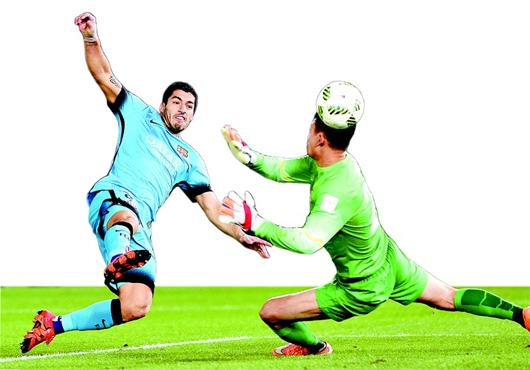 两年前,恒大就在世俱杯半决赛和另一支“宇宙队”拜仁交过手,如今对手变成同样强大的巴萨,就连比分也和当时如出一辙。比赛也体现出双方的实力差距,全场巴萨控球率高达75%,射门达到17次。尽管恒大队员严格按照斯科拉里赛前的布置有针对性的防守,但巴萨还是在看似不经意的传控中,利用节奏的变化找到了破门的机会。第一个进球就是经过多脚传递而最终破门,中间虽曾被恒大断掉,但巴萨立刻就地反抢获得远射机会,最终苏亚雷斯补射得分。第二个进球则是典型的中路配合,甚至就是巴萨最常用的教科书式入球方式,队长伊涅斯塔传出一记大师级的过顶球,巧妙前插的苏牙再次把握机会得分。