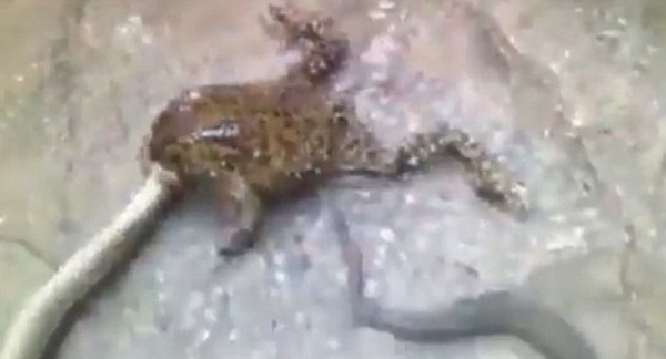 巨大蟾蜍“逆袭”欲吞食1米长蛇(视频)