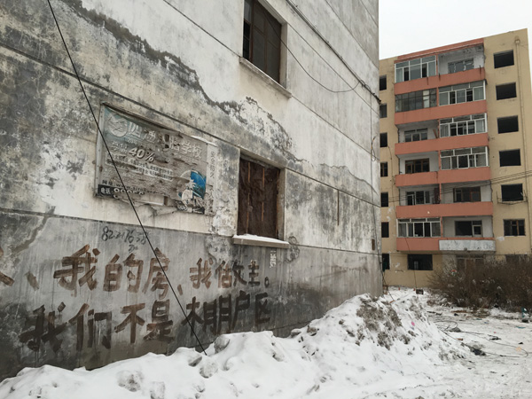 如今4年过去了。2015年12月14日,澎湃新闻来到这片“被棚改”的小区,看到的是一片片被白雪覆盖的废墟,以及虽未被拆毁,但大部分窗户已被砸碎,无法再居住的数栋小楼。一栋7层的小楼外墙上仍能看到清晰的棕色大字:“我的房,我做主!我们不是棚户区。”