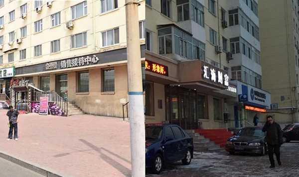 文景街棚改项目计划建设“金色里程”商业体。此前,建设单位还曾在文景街小区附近搭建了项目售楼处(左),目前已消失,变成了一家理财公司(右)。 小区居民供图澎湃新闻记者 罗杰 图