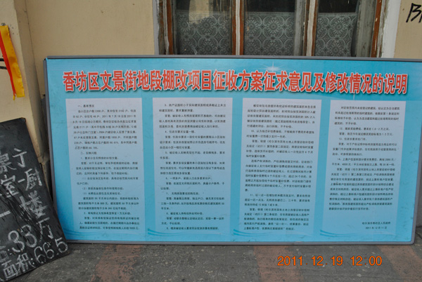 2011年12月11日,文景街小区服务中心突然挂出一个公示板,名为“香坊区文景街地段棚改项目征收方案征求意见及修改情况的说明”。这份说明称,经过文景街小区80.78%的被征收居民同意,决定正式对该小区进行征收。
