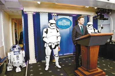 好莱坞科幻片《星球大战:原力觉醒》18日在美国上映,白宫同样陷入“星战热”。在当天举行的年终记者会上,白宫发言人乔希·欧内斯特在两名真人扮演的“帝国突击队”士兵和原比例制造的R2—D2机器人玩具陪同下进入白宫西翼的新闻发布厅。欧内斯特站在台上,两名帝国士兵分列左右,R2—D2机器人玩具奏响《星球大战》主题曲以及一些爱国歌曲的调子,同现场媒体记者互动。 文/图 据新华社$$$$$$$$qualitylevel=B