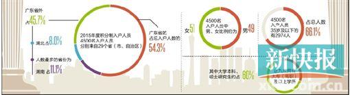 据广州市来穗局统计分析,4500名入户人员分别来自北京、福建、新疆等29个省(市、自治区),其中来自广东省的占总入户人数的54.3%,除广东以外,人数最多的省份为湖南,占11.1%;入户人员中有畲族、黎族、毛南族等17个少数民族。