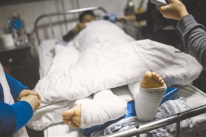 在光明新区人民医院住院的29岁伤者姚先生,双腿胫骨骨折,已经打上了石膏,刚到没多久的保险工作人员正在给他的腿拍照。灾难发生时,姚先生从所在的宿舍二楼窗台跳出时受伤。
