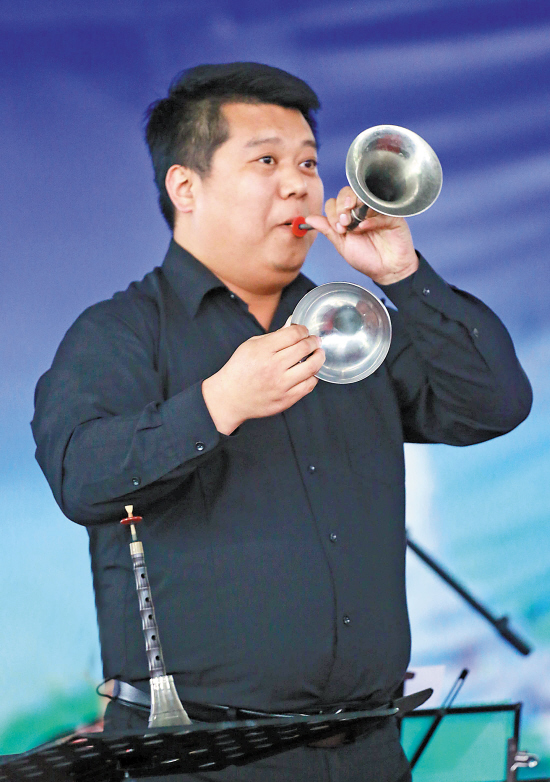 当天最大的惊喜当属青年唢呐演奏家吴林原带来的唢呐独奏《锔大缸》。吴林原自幼生长于安徽唢呐世家,随祖父——著名安徽唢呐演奏家吴安明学艺,后师从星海音乐学院唢呐教授李建中。吴林原把唢呐玩出了多种不同的花样:只见他左手举着唢呐,右手拿着一个不锈钢碗,把碗靠近喇叭处,改变唢呐的音色,听起来竟然近似于人说话的声音。吴林原介绍,用碗来改变音色是一种民间唢呐演奏技巧,目前学院里还没有教授。这个碗究竟有什么神奇之处?吴林原说:“碗只是路边随手买的一个碗,不过底部较圆,跟喇叭的形状比较契合。”