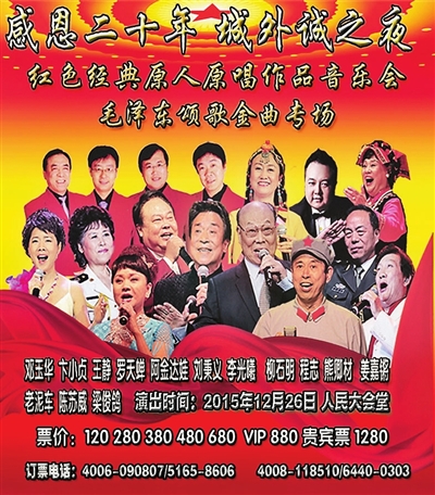 2015年12月26日在北京人民大会堂将隆重举行“《感恩二十年城外诚之夜》——红色经典原人原唱作品音乐会”。这是一台以毛泽东颂歌为主题的红色经典作品专场音乐会。