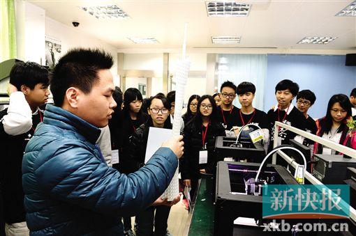 ■近日,广州机电技师学院举行信息艺术设计系学生毕业作品展暨赴太行山写生作品展,展出了该系学生的产品设计、动漫设计和珠宝设计等优秀作品,引来“同根同心——香港初中及小学内地交流计划”广州交流团参观。图为香港学生参观3D打印技术如何制作小蛮腰模型。