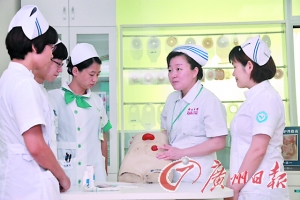 叶新梅(右二)指着腹部模型上的造口,向同事讲解。
