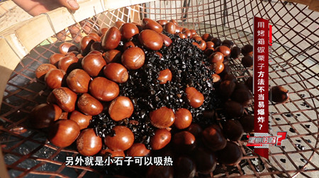 张威说,商家炒栗子的时有专用的炉具,每次翻炒的时候把最底下受热的栗子翻到上面来接触冷空气使它散热。同时炒锅里还放有很多小石子,小石子包围栗子使栗子处在一个受热均匀的状态,小石子还可以吸热,把火的温度吸收走,使栗子处在一个温度相对较低且恒温的状态。