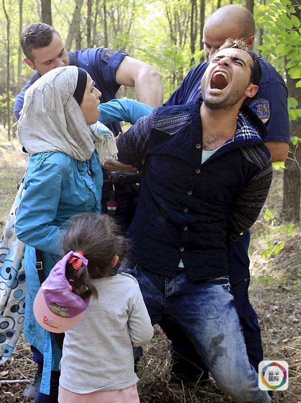 在匈牙利与塞尔维亚交界的匈牙利勒斯凯附近,一个叙利亚难民家庭进入匈牙利后被匈警方逮捕。(新华社/路透)
