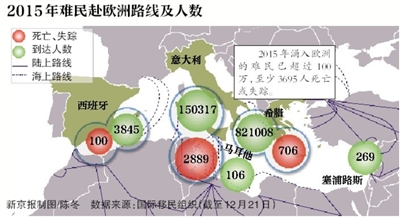 截至12月21日,共有100.55万人抵达希腊、保加利亚、西班牙、意大利、马耳他和塞浦路斯。国际移民组织和联合国难民署在联合声明中说,其中绝大多数通过海路渡过地中海或爱琴海进入欧洲,半数是逃避战争的叙利亚人、20%是阿富汗人,7%是伊拉克人。