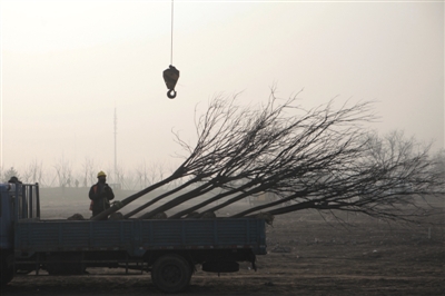 昨日,朝阳区五里桥村,一处出租大院拆除完毕,工人运来的树苗准备栽种在完成平整的土地上。新京报记者 王嘉宁 摄