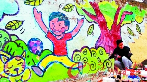 人们在围墙上绘画,呼吁摒弃隔阂(右图)。