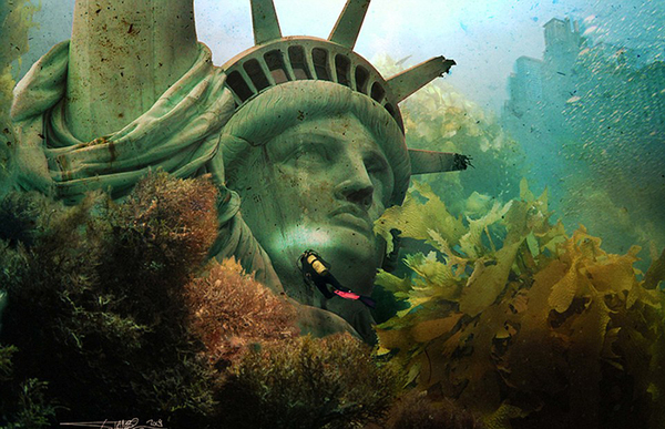 在麦吉的想象中,自由女神的头像可能会被大洪水淹没在水下。(网页截图)