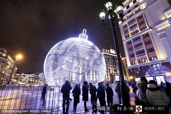 当地时间2015年12月15日,俄罗斯莫斯科,一个17米高的圣诞树装饰彩球造型灯饰亮相莫斯科Manege广场。该灯饰由LED小灯组成,预计将入选吉尼斯世界纪录。