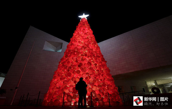 当地时间2015年12月4日,墨西哥一座历史博物馆外,用塑料瓶和塑料果篮制作的圣诞树亮灯。