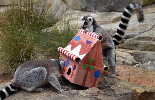 在澳大利亚悉尼的塔朗加动物园,两只环尾狐猴“好奇地”拨弄动物园特意为它们准备的圣诞礼物。