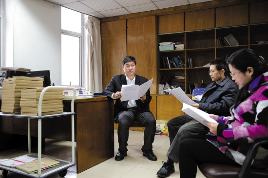 刘德敏(左一)与合议庭的成员在讨论案件 羊城晚报通讯员 徐志毅 摄