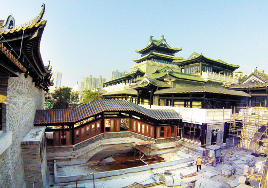 从荔湾区恩宁路走进粤剧艺术博物馆工地,目之所及,外墙工程已基本成型。建筑风格十分古典雅致,穿插在亭台楼阁、石山园林间的是一座座伴随着潺潺流水的小桥。