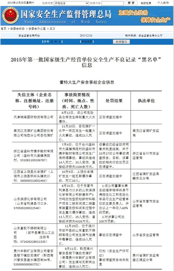 安监总局公布了2015年第一批国家级生产经营单位安全生产不良记录“黑名单”