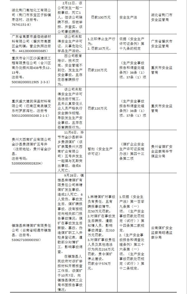 因发生重大事故被列入“黑名单”的企业还有黑龙江龙煤矿业集团股份有限公司鸡西分公司杏花煤矿、浙江省温岭市捷宇鞋材有限公司、江西省上饶县永吉煤矿、山东滨源化学有限公司、山东富凯不锈钢有限公司、贵州丰联矿业有限公司普安县楼下镇政忠煤矿。这些企业被列入黑名单均是因为发生了造成10人及以上死亡的重大事故。