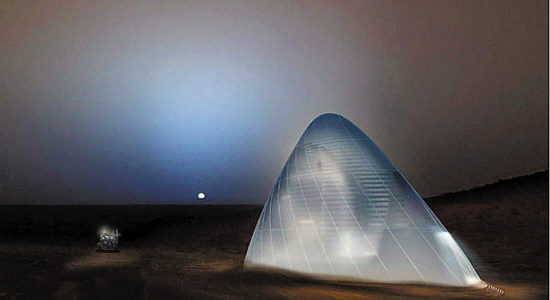这是直接利用火星上丰富的冰资源和低温气候设计的住所,它的外形类似鲨鱼鳍。这样的设计据说灵感来自于爱斯基摩人的冰屋——看似很冷,实际上屋内却非常暖和。其最大好处除了保温,就是建筑材料可就地取材。