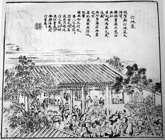 《时事画报》这幅图(下图),是描绘广州城隍庙里市民打地气的情状。所附文字大意是:打地气这种陋习,虽然经过警局宣布禁止,可是无知男女当它是官样文章,并不理会,照做无误。每年农历七月廿四神诞,庙里庙外挤满了人,或坐或卧,长龙一直排到藩司衙门前(今财厅前路口)。巡警巡逻见此情状,也无可奈何。