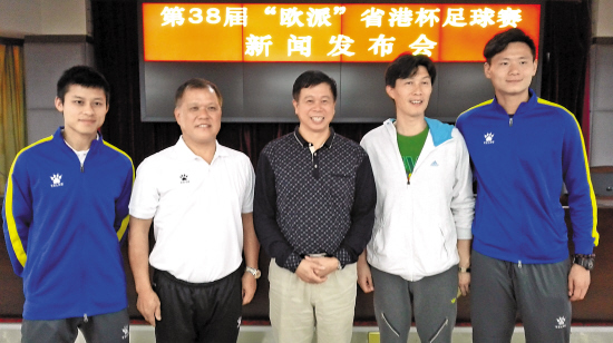 (从左到右)球员陈志钊、广东队主教练陈玉良、省足管中心主任程志文、总教练区楚良、球员唐德超在省港杯新闻发布会上 林本剑 摄