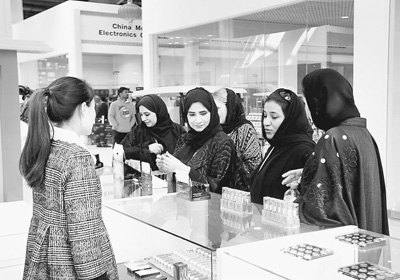 在刚刚开业的中国龙城内,几位巴林女顾客在选购化妆品。