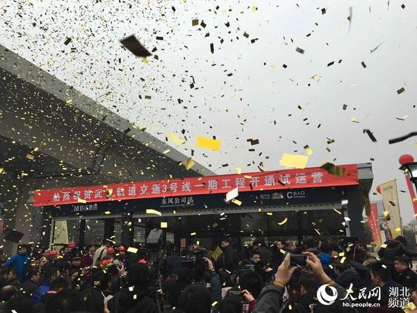 人民网武汉12月28日电 (肖璐欣)28日上午,武汉轨道交通3号线一期如期竣工通车。3号线一期工程是首条穿越汉江的轨道交通线路,武汉轨道交通实现了“连通三镇” 到“环通三镇”的跨越,汉口与汉阳市民穿越汉江仅需3分钟。