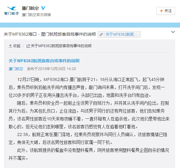 原标题:厦航:小伙在飞机洗手间自残“用塑料餐具自杀”消息不实