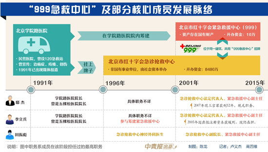 急诊抢救中心1996年脱胎于一家名为“学院路医院”的民营机构,1998年该机构内部又开始筹建“999”。此后,学院路医院原负责人李立兵、邸杰入驻这两家事业单位,共同担任领导。发展中,李立兵2005年因虚报注册资本获缓刑,邸杰2007年落马并获刑12年。