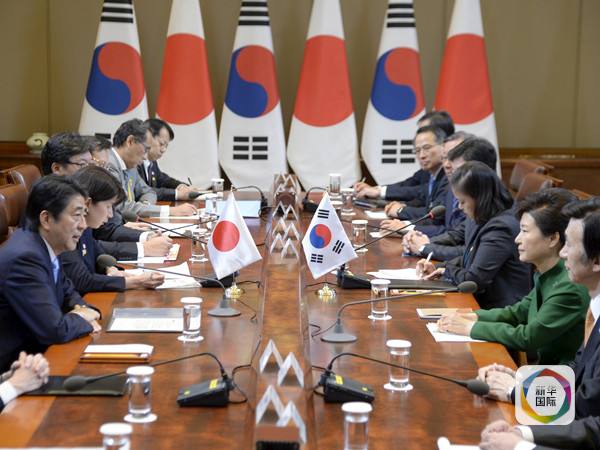 2015年11月2日,在韩国首尔,韩国总统朴槿惠(右二)与日本首相安倍晋三(左一)在青瓦台举行会谈。( 图片来源:新华/路透)