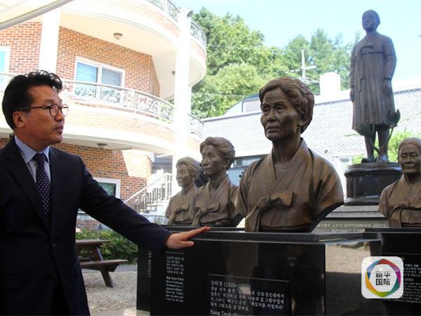 2015年9月14日,在韩国京畿道广州市乡下的慰安妇“分享之家”,所长安信权在向来访者介绍已故慰安妇受害者的铜像。