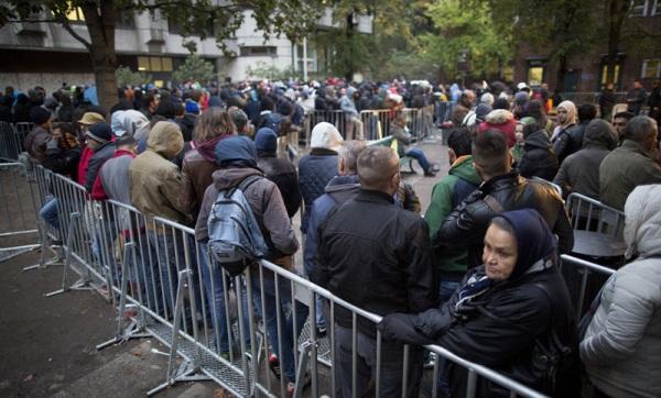 10月9日,在德国首都柏林,难民在卫生与社会事务部门外排队等待登记注册。(新华/法新)