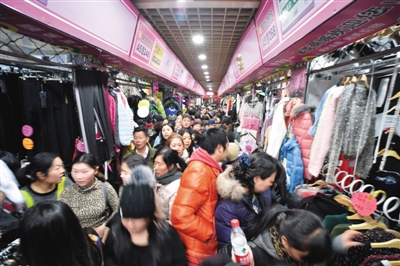 昨日,市民在即将疏解闭市的聚龙外贸服装商城扫货。位于西城“动批”商圈的第一家地下服装批发市场——聚龙外贸服装商城将于12月31日正式闭市,不少市民闻讯赶来扫货。据了解,2015年年底前,“动批”摊位要减少60%以上。到2016年,“动批”30万平方米市场将全部疏解。新华社记者 罗晓光 摄