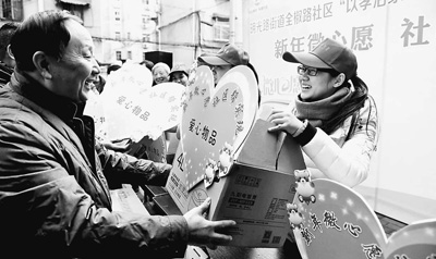 12月29日,安徽合肥市瑶海区明光路街道全椒路社区开展“微心愿”征集认领活动。志愿者向困难家庭和需要帮助的居民征集“新年微心愿”,倡导爱心居民和党员志愿者认领,结成帮扶对子,帮助实现心愿。图为居民在领取爱心物品。