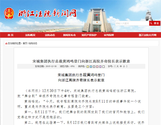 12月30日下午4时,宋城集团执行总裁黄鸿鸣前往浙江高院,就“舞台剧”举报齐奇院长之事专程登门致歉。