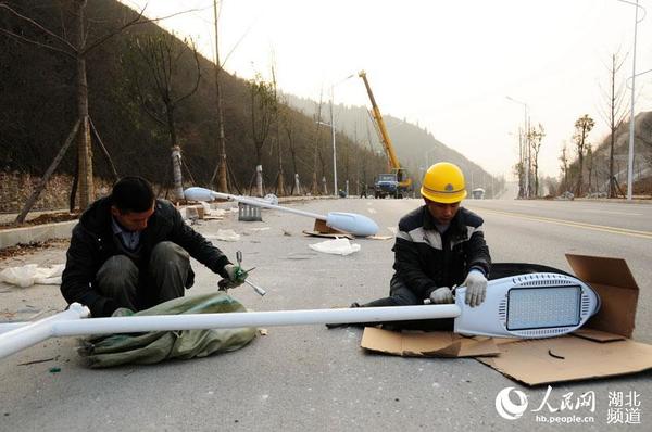 人民网十堰1月2日电 1月1日元旦这天,多组市政工人正在南水北调中线工程水源区,湖北省十堰市郧阳区汉江南岸复建的“长沙路”上安装路灯。复建的“长沙路”全长8.24公里,总投资3.6亿元,是一条环库生态景观旅游公路,此次最后安装的300杆路灯将于4日完成。