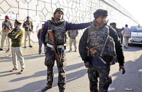 1月2日,在印度北部旁遮普邦的伯坦果德空军基地外,印度安全人员持枪警戒