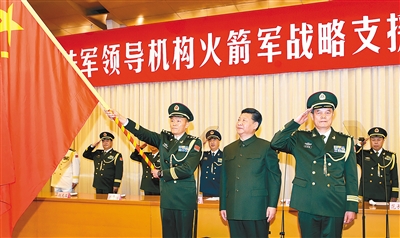 中国人民解放军陆军领导机构、中国人民解放军火箭军、中国人民解放军战略支援部队成立大会2015年12月31日在八一大楼隆重举行。中共中央总书记、国家主席、中央军委主席习近平向陆军、火箭军、战略支援部队授予军旗并致训词,代表党中央和中央军委向同志们、向全军部队致以热烈祝贺,强调要坚持以党在新形势下的强军目标为引领,深入贯彻新形势下军事战略方针,全面实施改革强军战略,坚定不移走中国特色强军之路,时刻听从党和人民召唤,忠实履行党和人民赋予的神圣使命,为实现中国梦强军梦作出新的更大的贡献。