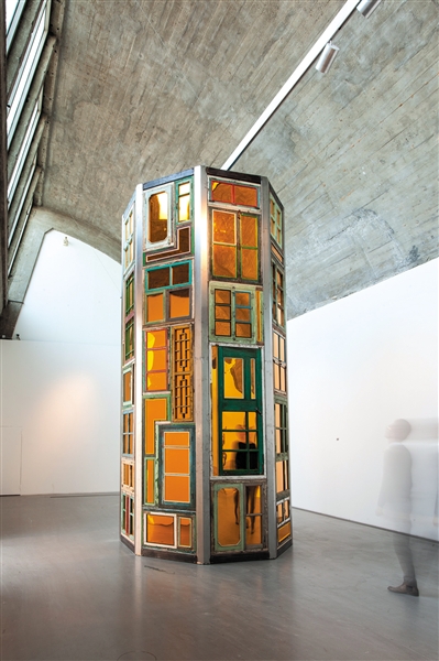 这是进入展厅中的第一件作品,虽依然是用废弃的门窗构成,但宋冬让它以金碧辉煌的面目出现。这件作品被称为《坐井观天》,意喻着人人都是井底之蛙,但每个人的井却不一样大。而其玄机便是宋冬将门放在了这一装置的后面。