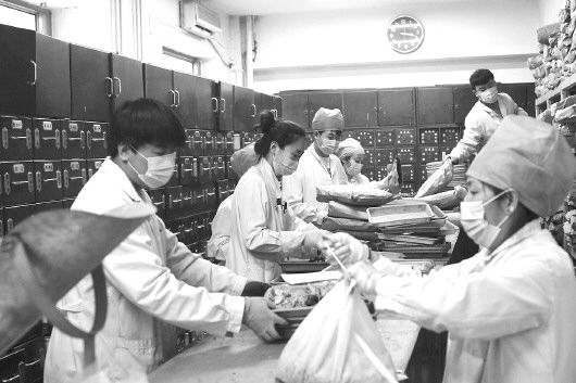 图为北京顺天德中医院工作人员在中草药房抓药。 本报实习生 李沐 摄