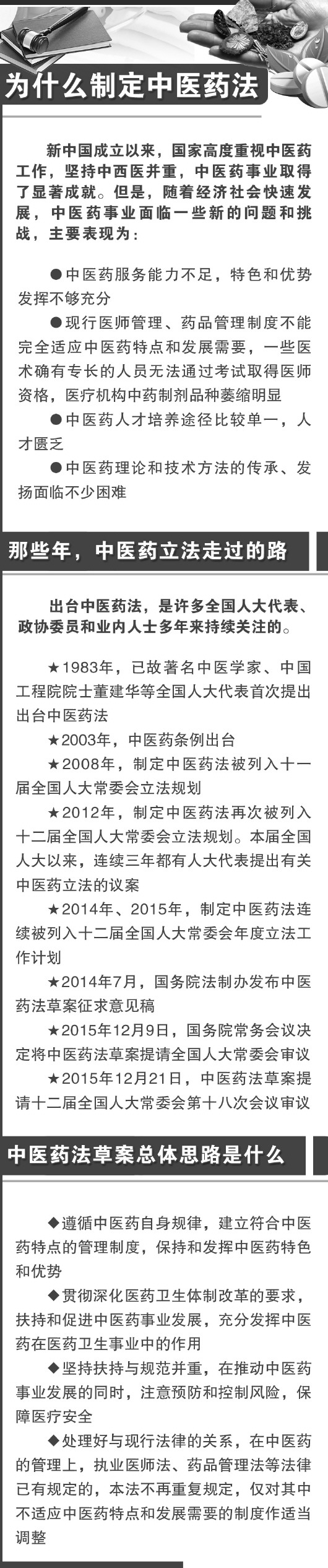 2015年12月21日,中医药法草案首次提请十二届全国人大常委会第十八次会议审议。一旦该法获得表决通过,我国将诞生首部中医药法律。